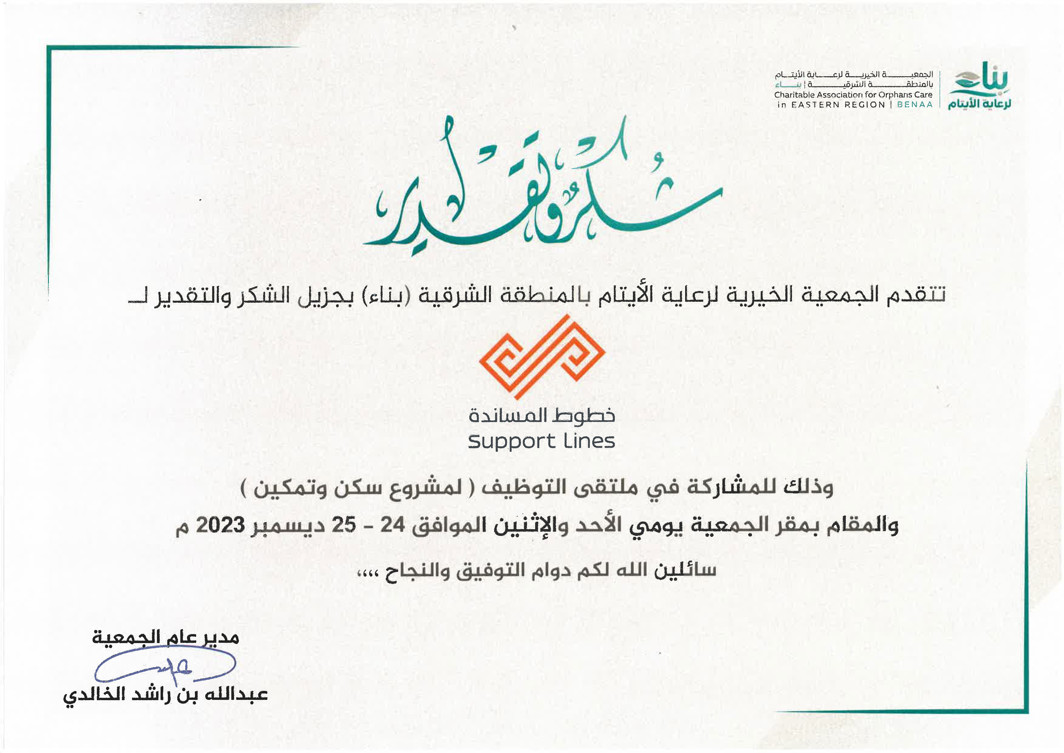At Support Lines, we strongly believe in the power of recognizing and appreciating the efforts and dedication of our team members and partners. These Certificates of Appreciation serve as a heartfelt expression of our gratitude and acknowledgment of the valuable contributions made by individuals and organizations. We celebrate every achievement and take pride in every partner who has contributed to our success and excellence.